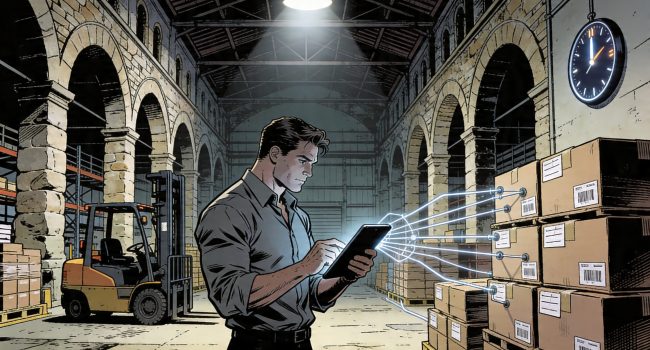 Imprenditore che gestisce ordini B2B digitali tramite tablet in un magazzino fiorentino con arcate in pietra