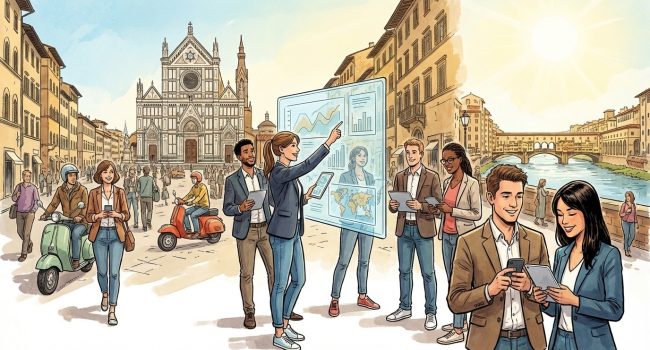 Illustrazione in stile fumetto che rappresenta una micro-community digitale a Firenze